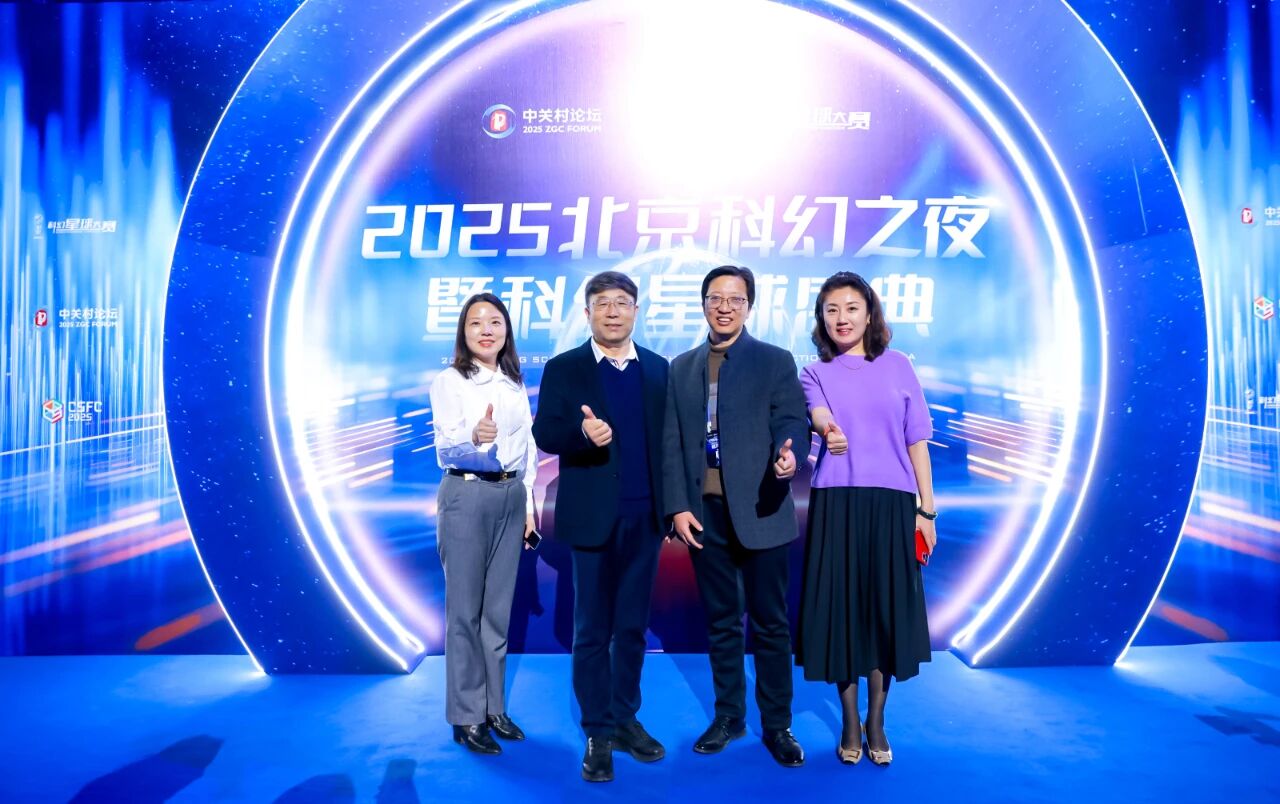 金洲集团兼云南湄公河集团董事长俞锦方(左二)与科幻小说《红土地》获奖作者萧星寒(左三)现场合影